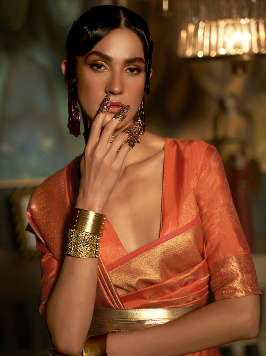 Women's Silk Blend Peach Woven Design Handloom Saree With Blouse Piece