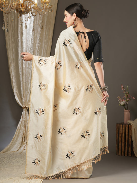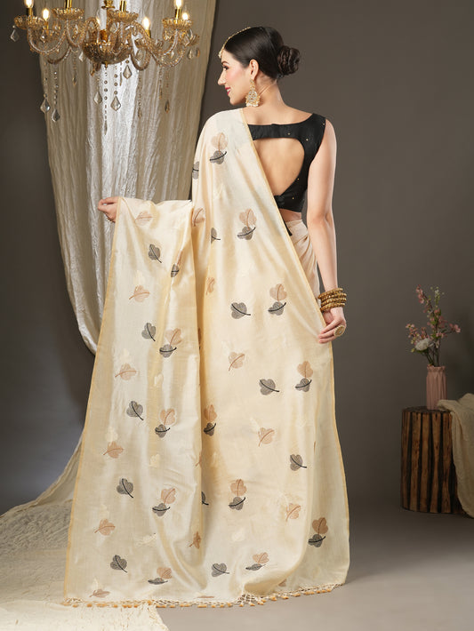 Women's Silk Blend Cream Embroidered Designer Saree With Blouse Piece
