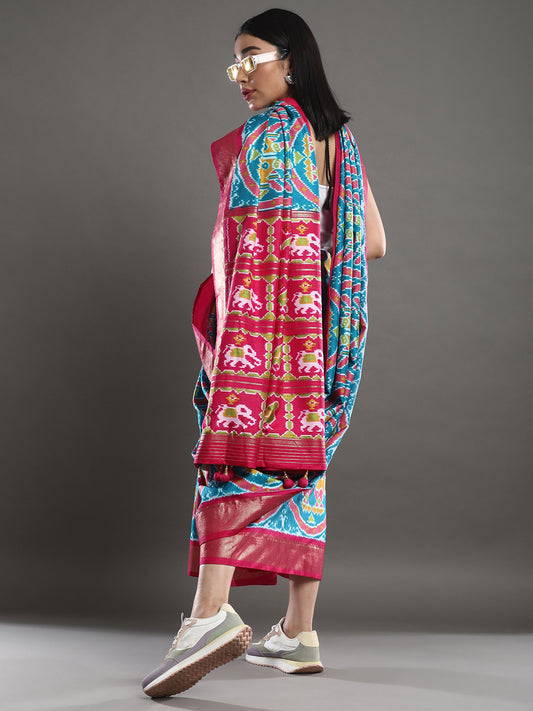 Women's Silk Blend Teal blue Woven Design Handloom Saree With Blouse Piece