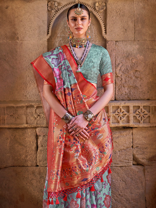 Women's Silk Blend Sea Green Woven Design Designer Saree With Blouse Piece