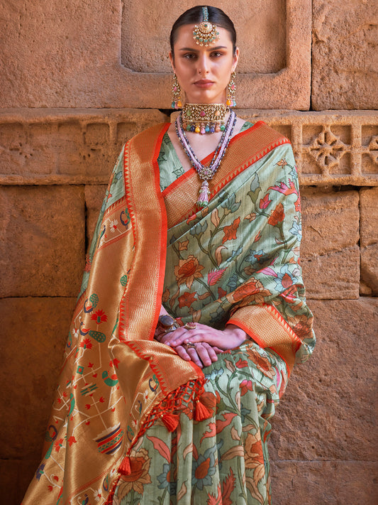 Women's Silk Blend Light Green Woven Design Designer Saree With Blouse Piece