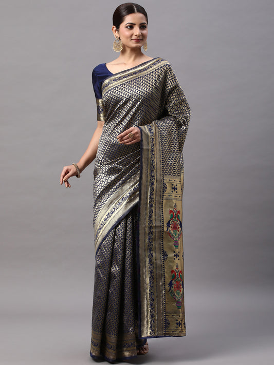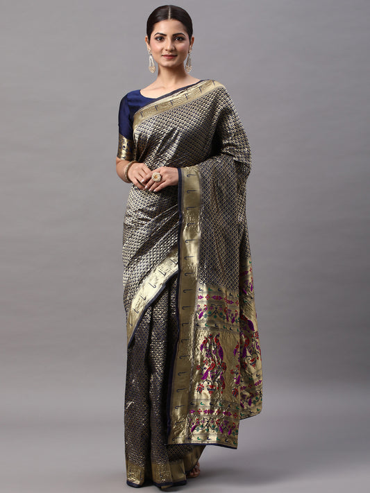 Women's Silk Blend Navy Blue Woven Design Designer Saree With Blouse Piece