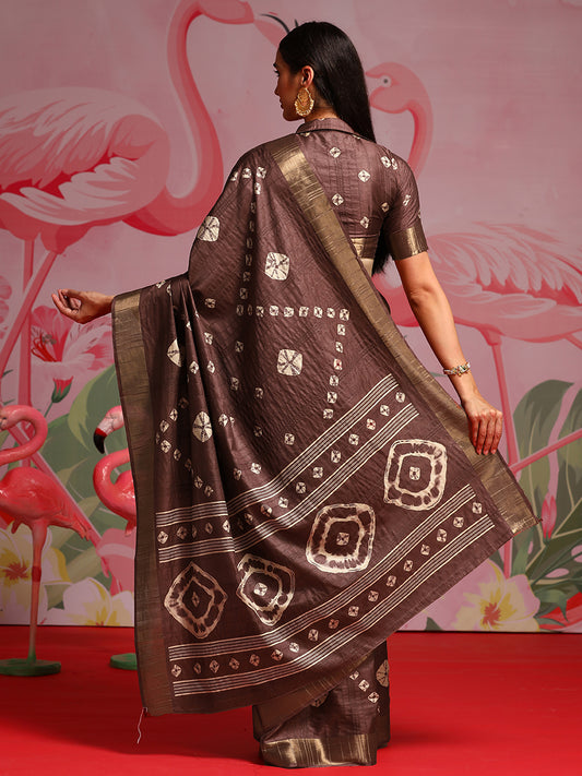Women's Silk Blend Brown Printed Designer Saree With Blouse Piece