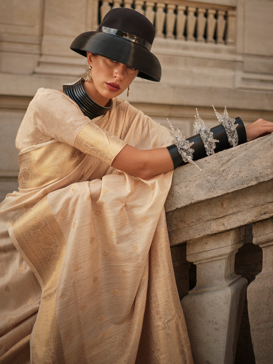 Women's Silk Blend Cream Woven Design Celebrity Saree With Blouse Piece