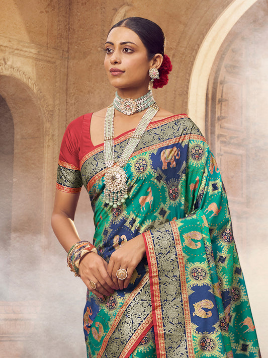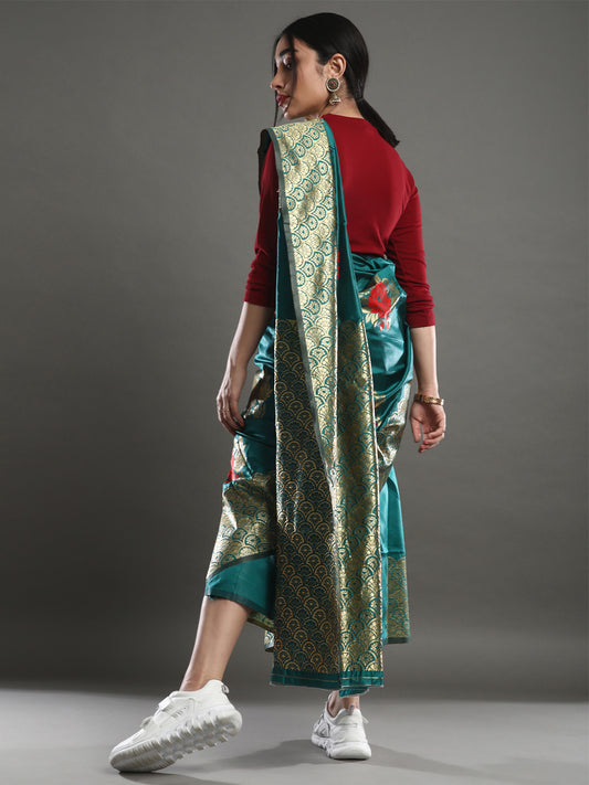 Women's Silk Blend Teal green Woven Design Designer Saree With Blouse Piece