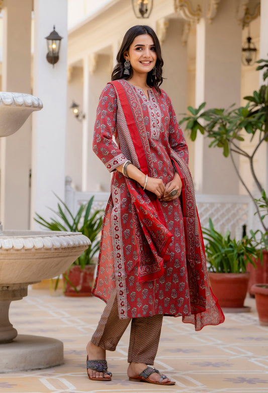 Women Viscose Printed Red Kurta And Pant Set With Dupatta