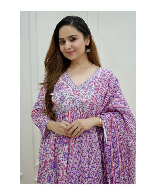 Women Viscose Printed Purple Kurta And Pant Set With Dupatta