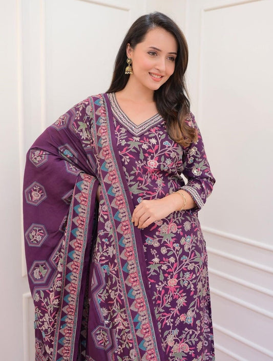 Women Purple Embroidery Viscose Rayon Kurta, Pant And Dupatta Set