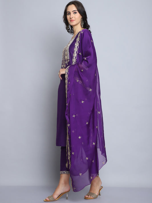 Women Purple Embroidery silk Kurta And Pant Set With Dupatta