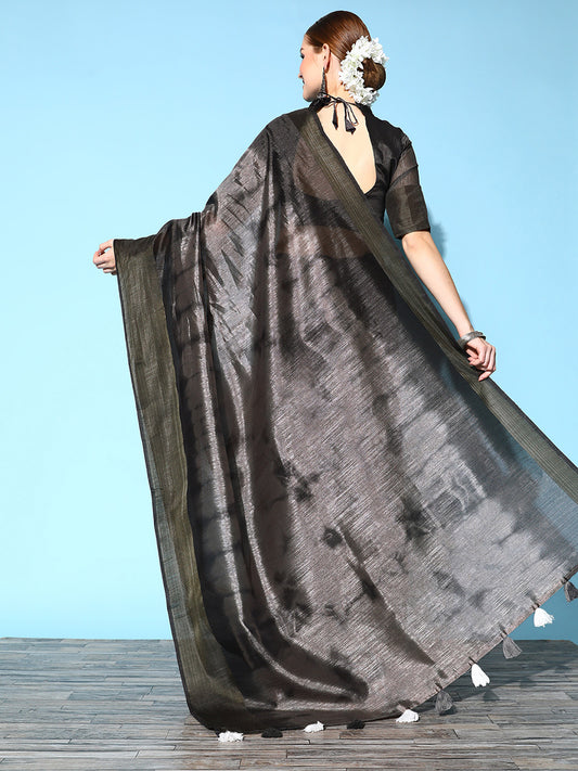 Women's Cotton Silk Charcoal Grey Printed Celebrity Saree With Blouse Piece