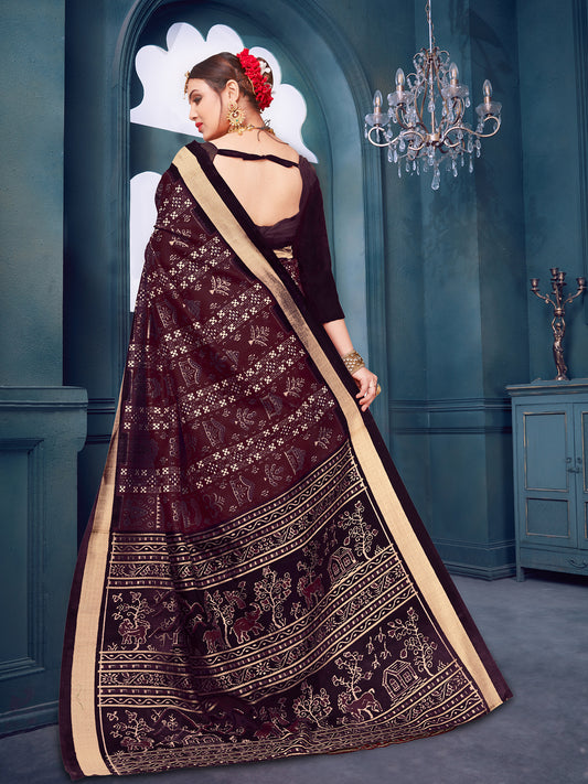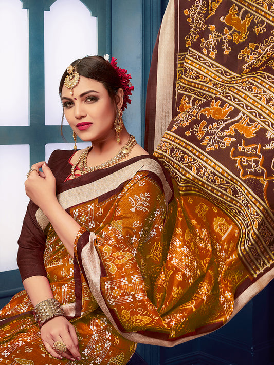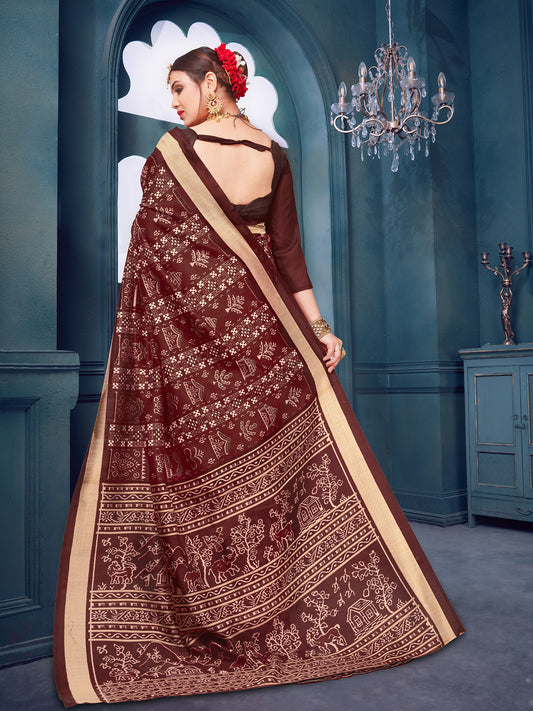 Women's Bhagalpuri Silk Brown Printed Designer Saree With Blouse Piece