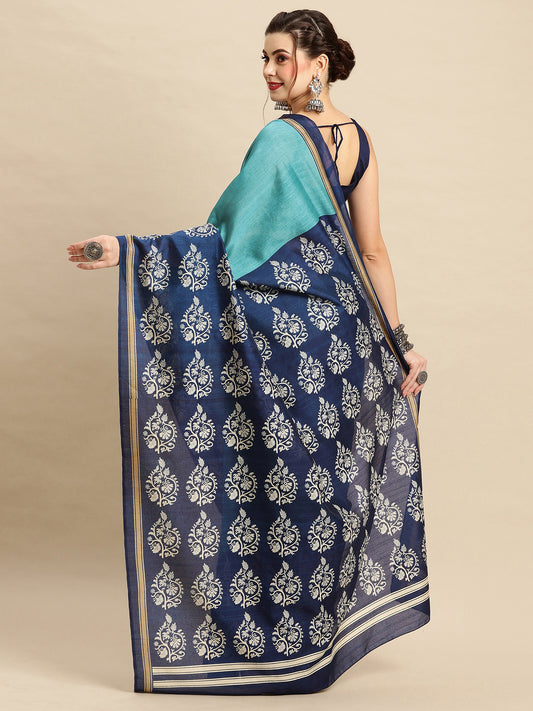 Women's Bhagalpuri Silk Navy Blue Printed Designer Saree With Blouse Piece