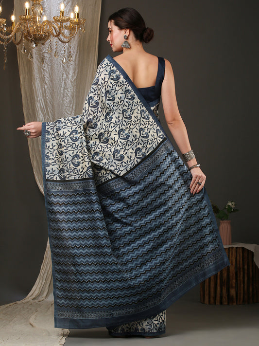 Women's Bhagalpuri Silk Off White Printed Designer Saree With Blouse Piece