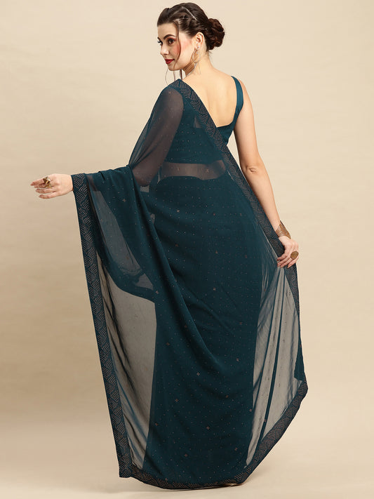 Women's Georgette Teal blue Embellished Designer Saree With Blouse Piece