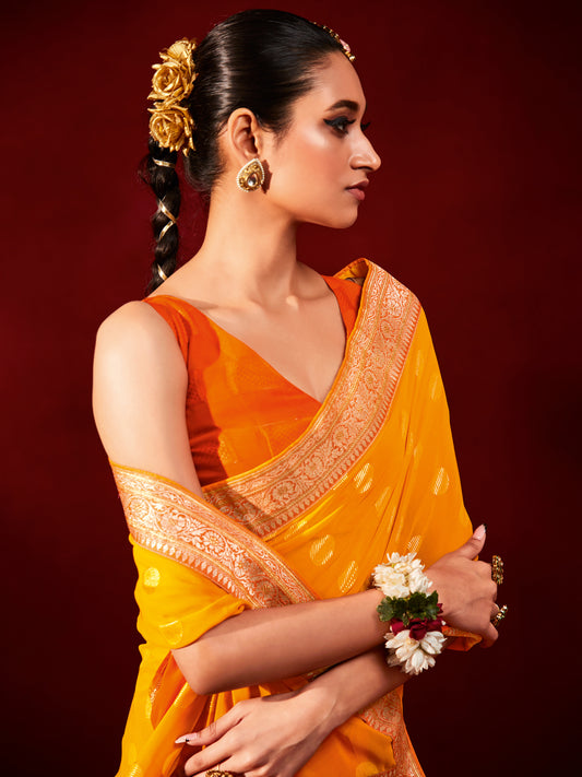 Women's Georgette Yellow Printed Designer Saree With Blouse Piece