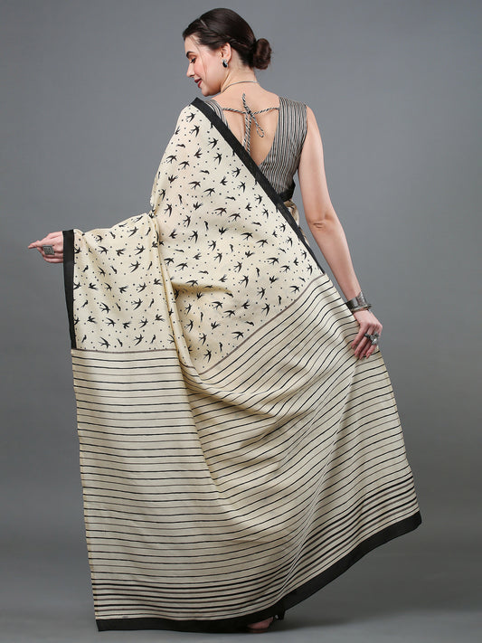 Women's Bhagalpuri Silk Cream Printed Designer Saree With Blouse Piece