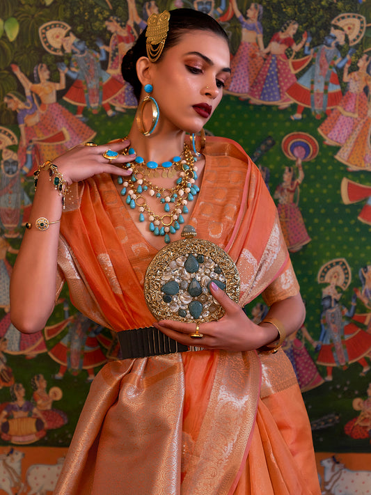 Women's Organza Peach Embellished Designer Saree With Blouse Piece