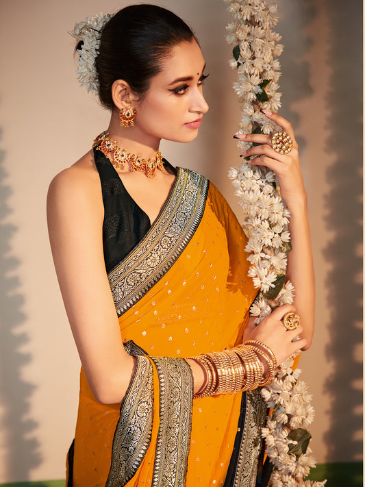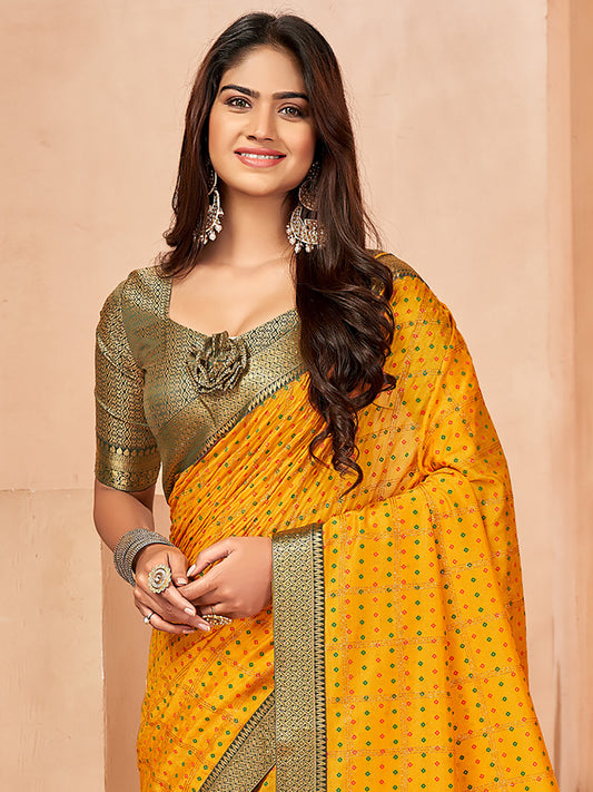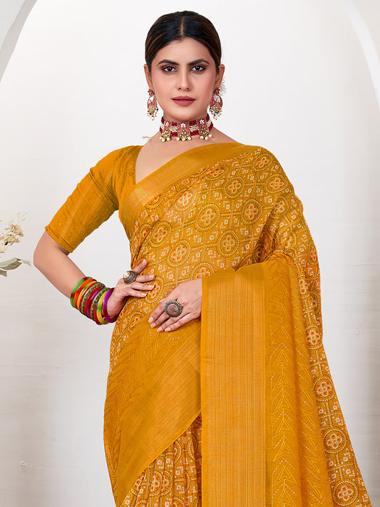 Women's Georgette Yellow Printed Designer Saree With Blouse Piece