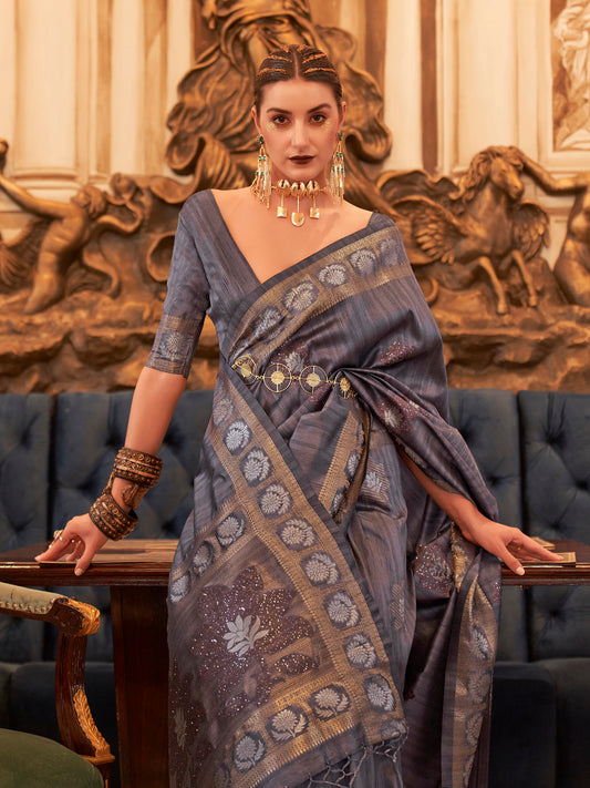 Women's Silk Blend Charcoal Grey Embellished Designer Saree With Blouse Piece
