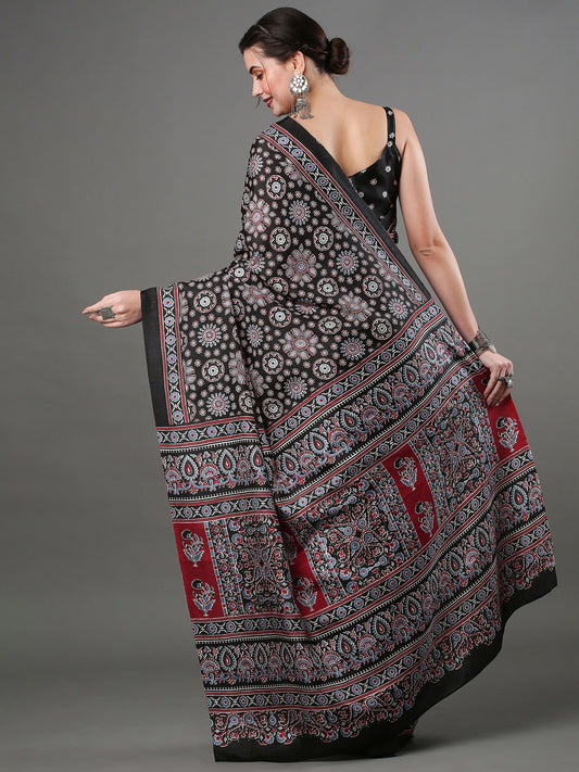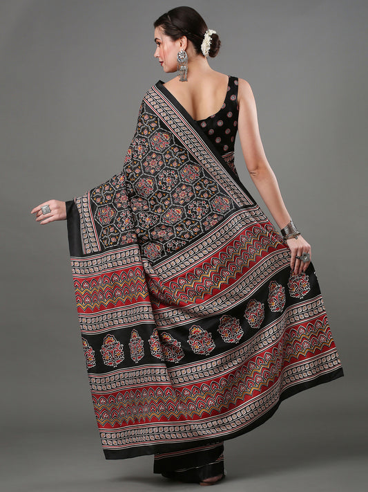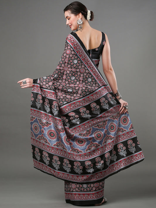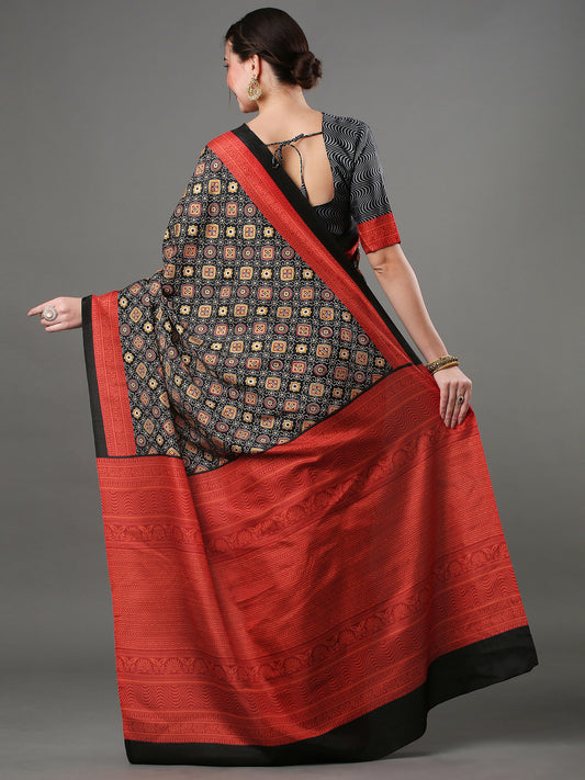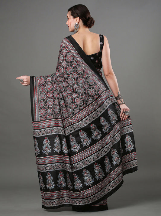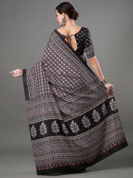 Women's Bhagalpuri Silk Black Printed Designer Saree With Blouse Piece