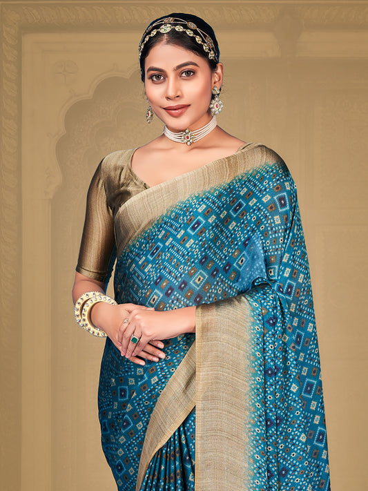 Women's Chiffon Blue Printed Designer Saree With Blouse Piece