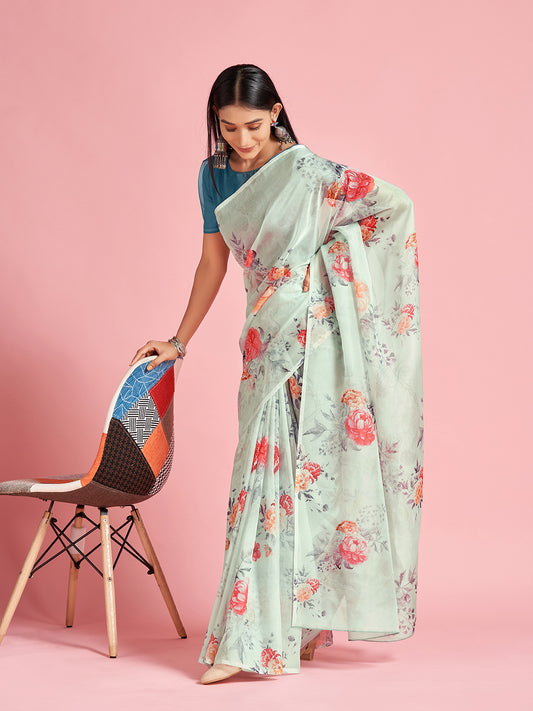 Women's Organza Turquoise Digital Print Designer Saree With Blouse Piece