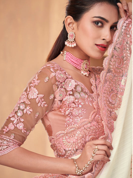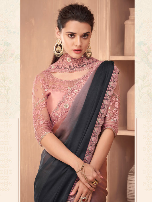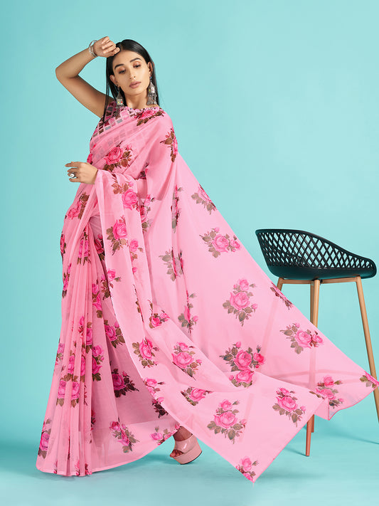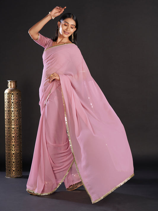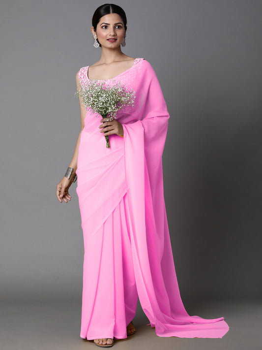 Women's Georgette Pink Embellished Celebrity Saree With Blouse Piece