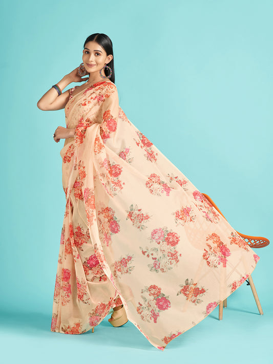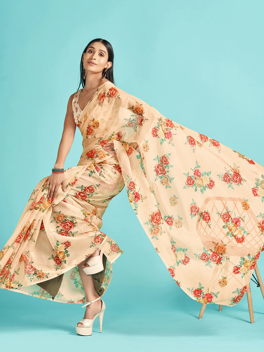 Women's Organza Cream Digital Print Designer Saree With Blouse Piece