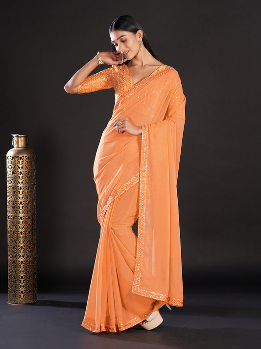 Women's Georgette Orange Embellished Designer Saree With Blouse Piece
