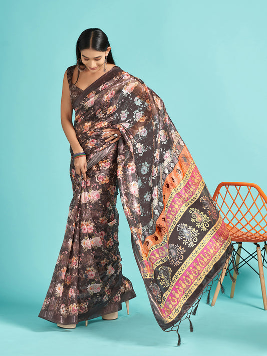 Women's Organza Brown Digital Print Designer Saree With Blouse Piece