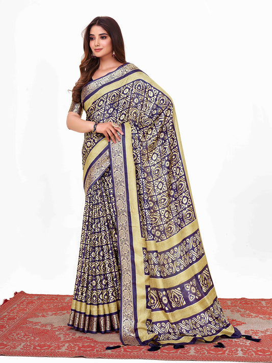 Women's Dola Silk Navy Blue Printed Designer Saree With Blouse Piece