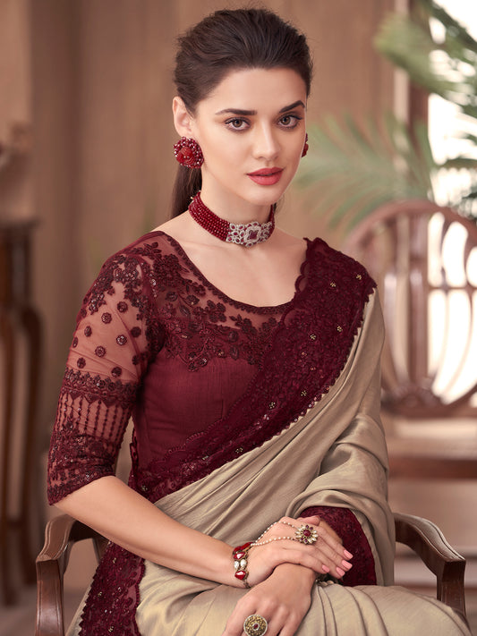 Women's Georgette Beige Embellished Designer Saree With Blouse Piece