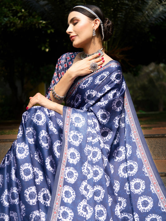 Women's Crepe Navy Blue Digital Print Designer Saree With Blouse Piece