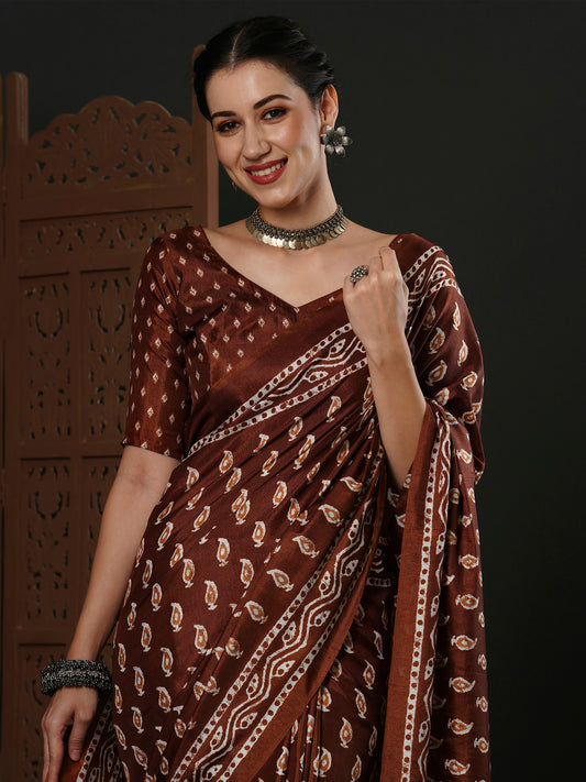 Women's Dola Silk Brown Printed Designer Saree With Blouse Piece