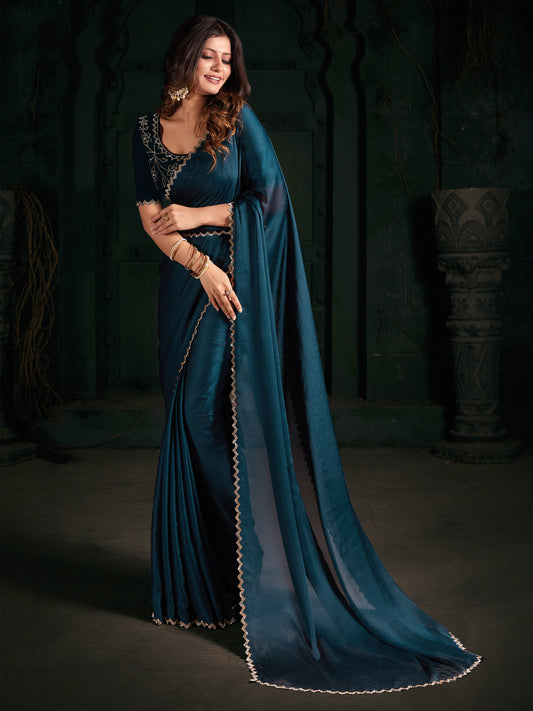 Women's Chiffon Teal blue Embellished Designer Saree With Blouse Piece