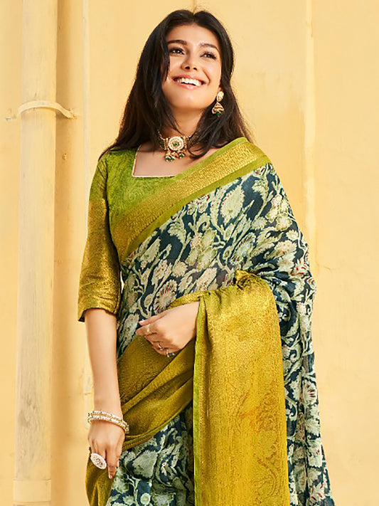 Women's Crepe Olive Digital Print Designer Saree With Blouse Piece