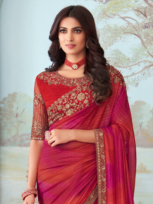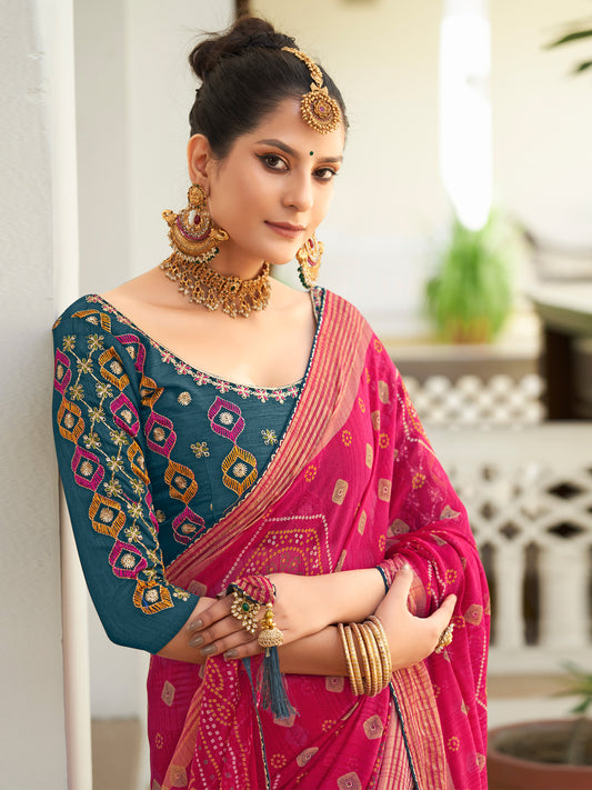 Women's Chiffon Pink Embellished Designer Saree With Blouse Piece
