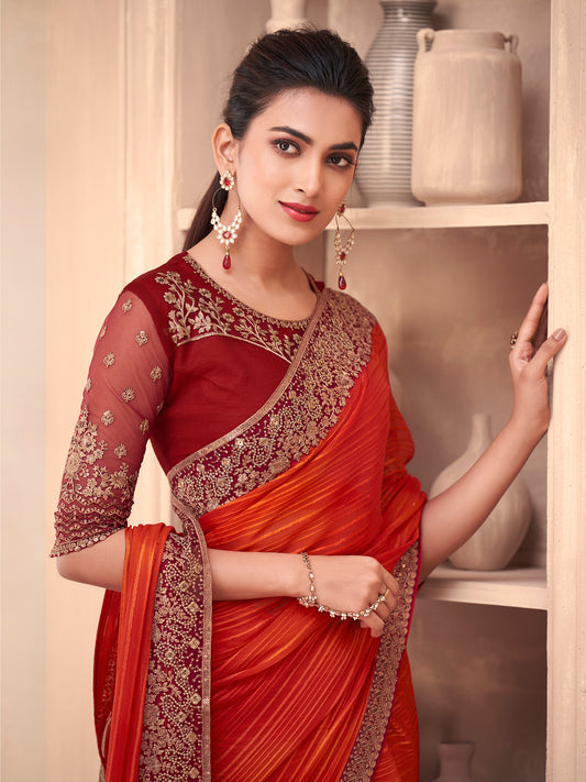 Women's Georgette Orange Embellished Designer Saree With Blouse Piece