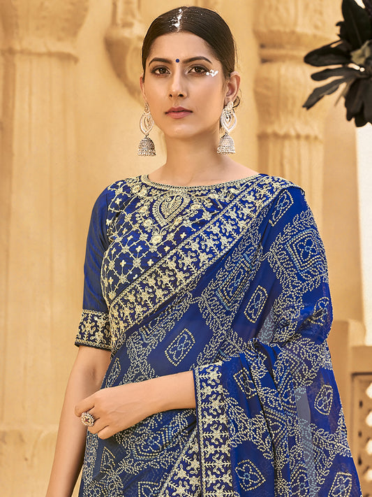 Women's Chiffon Blue Embellished Designer Saree With Blouse Piece