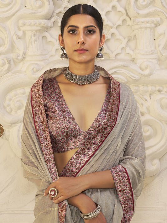 Women's Chiffon Grey Embellished Designer Saree With Blouse Piece