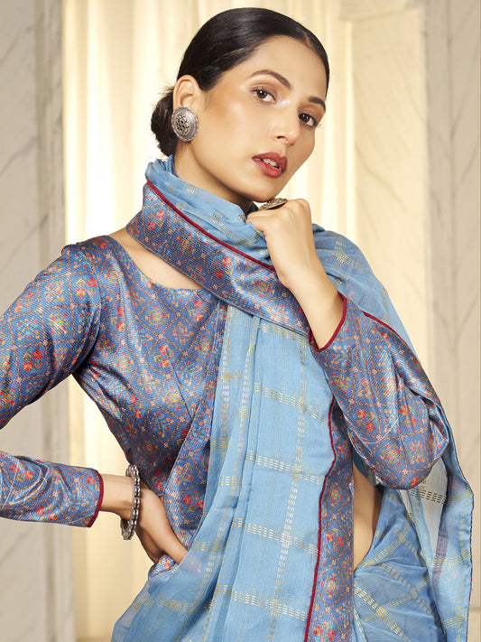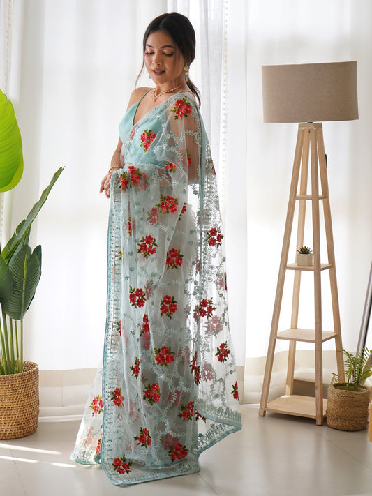 Women's Net Blue Embellished Designer Saree With Blouse Piece