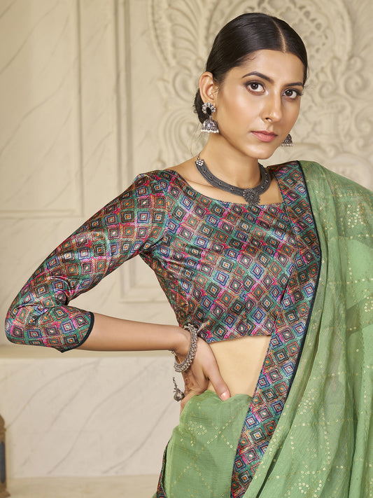 Women's Chiffon Light Green Embellished Designer Saree With Blouse Piece