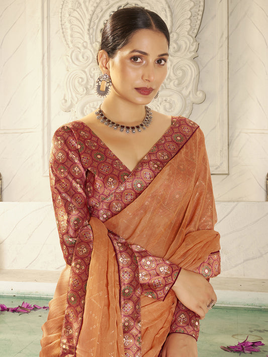 Women's Chiffon Peach Embellished Designer Saree With Blouse Piece