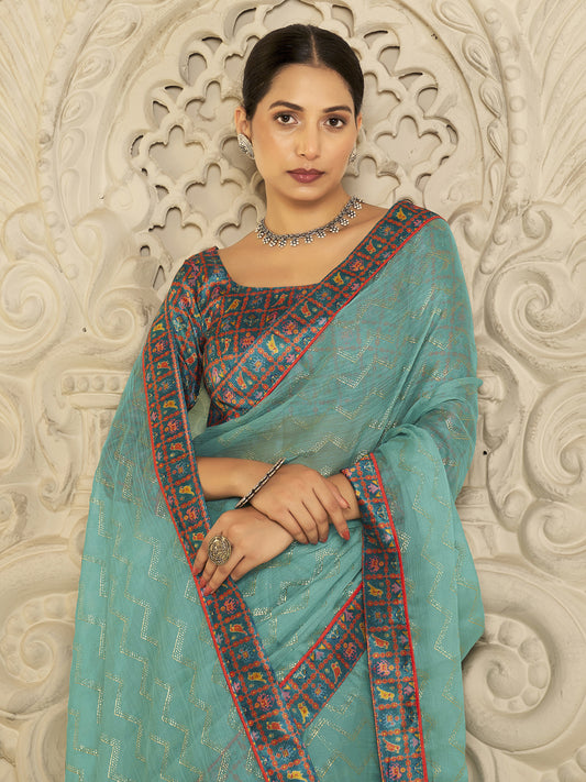Women's Chiffon Turquoise Embellished Designer Saree With Blouse Piece