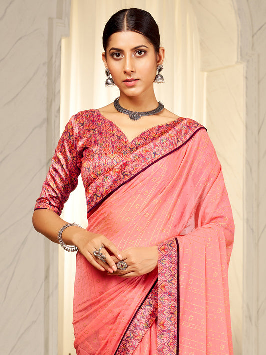 Women's Pure Chiffon Pink Embellished Celebrity Saree With Blouse Piece