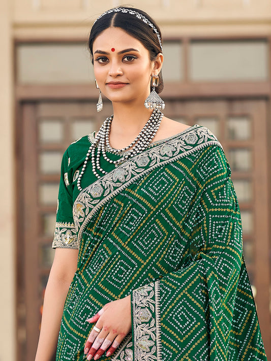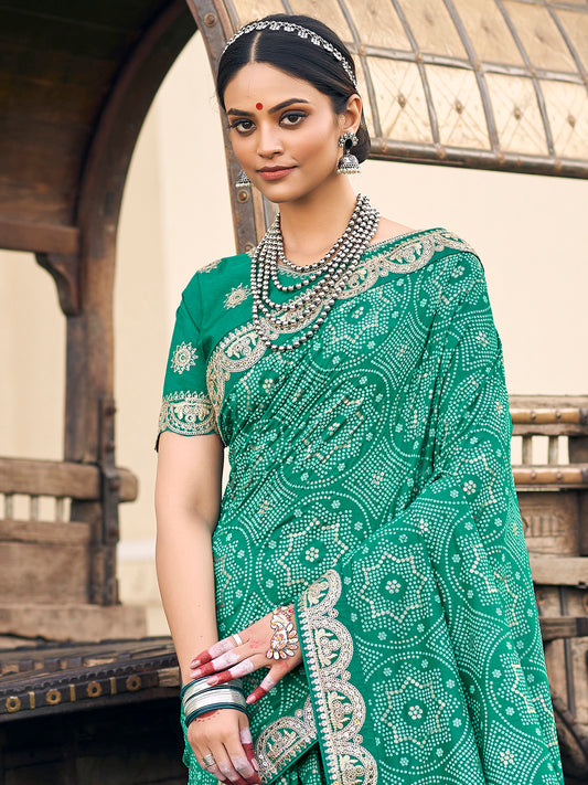 Women's Vichitra Silk Green Embellished Designer Saree With Blouse Piece