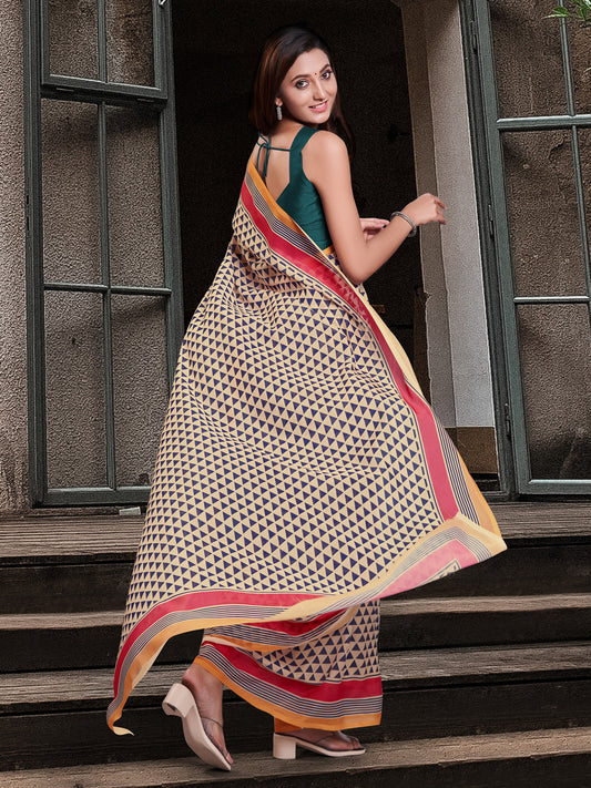 Women's Cotton Blend Cream Printed Celebrity Saree With Blouse Piece