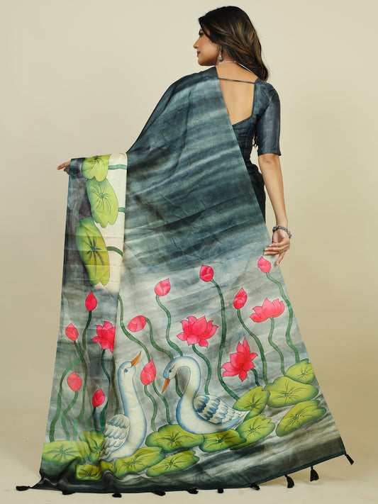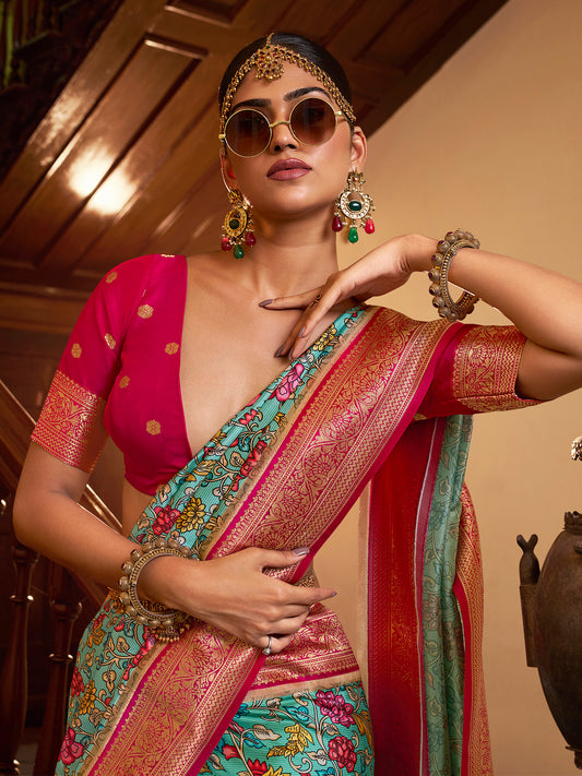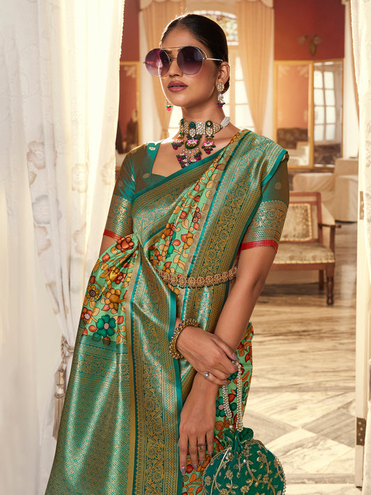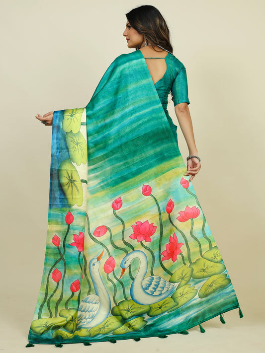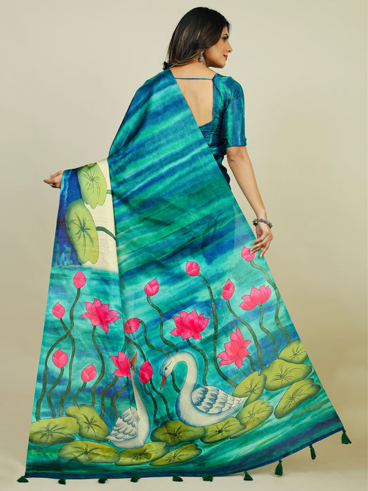 Women's Tussar Silk Sea Green Printed Designer Saree With Blouse Piece