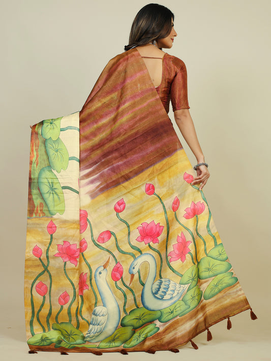 Women's Tussar Silk Brown Printed Designer Saree With Blouse Piece