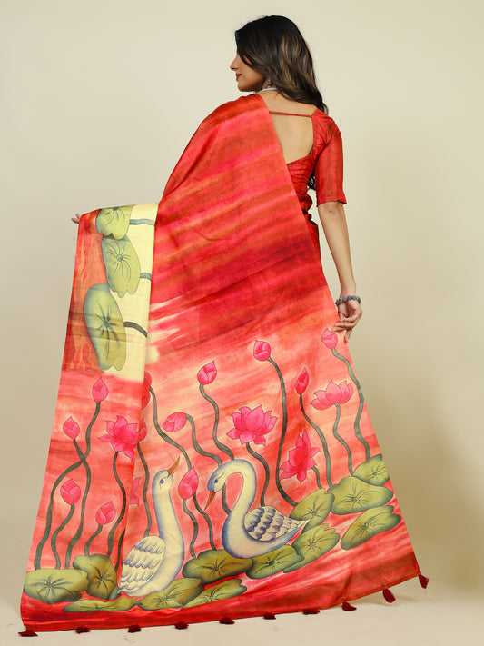 Women's Tussar Silk Red Printed Designer Saree With Blouse Piece